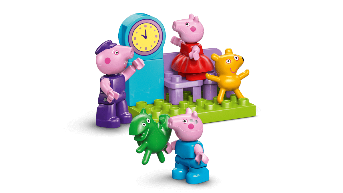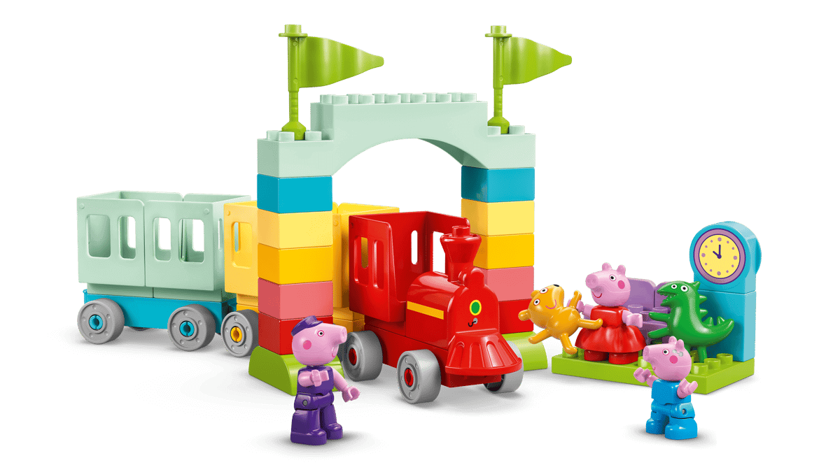 FEATURES FOR CREATIVE TRAIN PLAY – Includes Grandpa Pig, George Pig and Peppa Pig figures, a drivable toy train plus carriages, an arch made from bricks and a LEGO® DUPLO® station with a clock