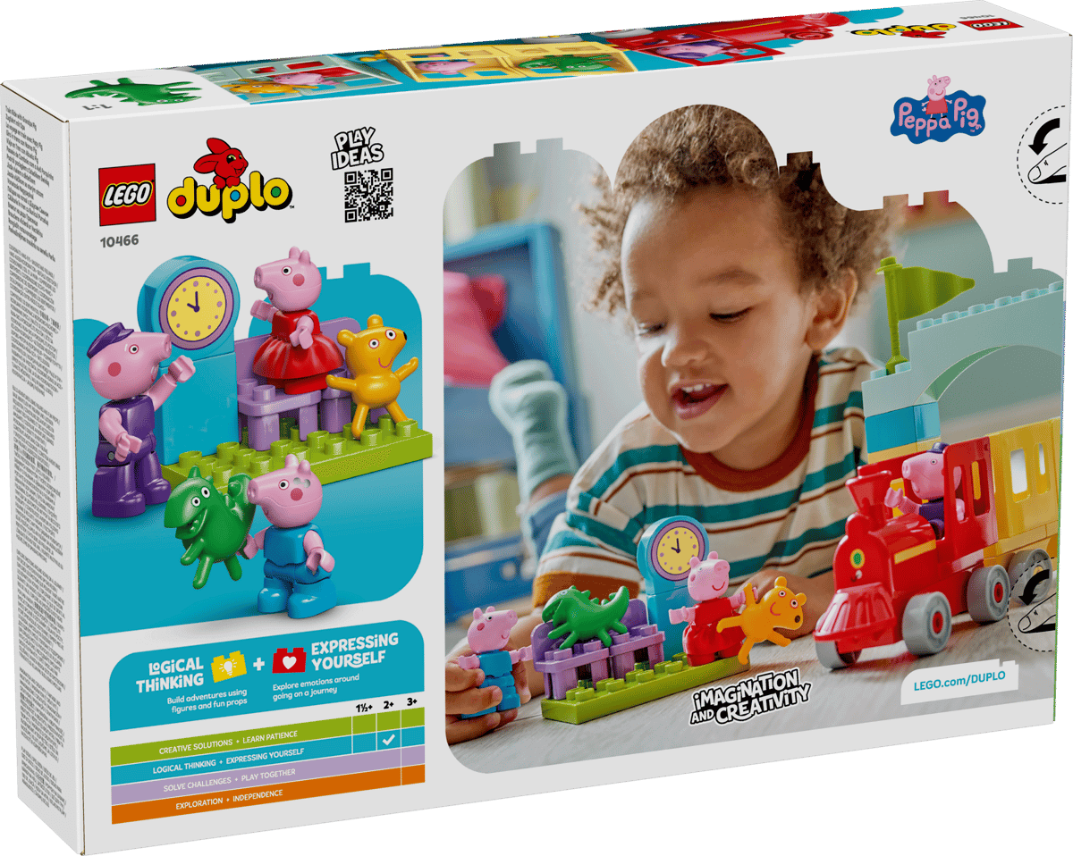 Toddlers ages 2 and up embark on an exciting learning journey with the Peppa Pig Train Ride with Grandpa Pig (10466) building toy. It comes with 3 characters – Grandpa Pig, Peppa Pig and George Pig – a drivable toy train with 2 carriages, an arch made from bricks and a LEGO® DUPLO® station with chairs and a clock. This educational gift can help toddlers’ skills grow as they play. They can learn that they must be patient waiting at the station for the train. Then with their fine motor skills they can place the Teddy and Mr. Dinosaur toys into the hands of the George and Peppa Pig figures to ensure they board safely before setting off. Toddlers can use hand-eye coordination and stacking skills to assemble the toy bricks into an archway. For extra learning, toddlers can then sort the bricks into carriages of matching colors. LEGO DUPLO Peppa Pig learning toys let toddlers develop early skills while recreating scenes from their favorite show. Set contains 35 pieces.