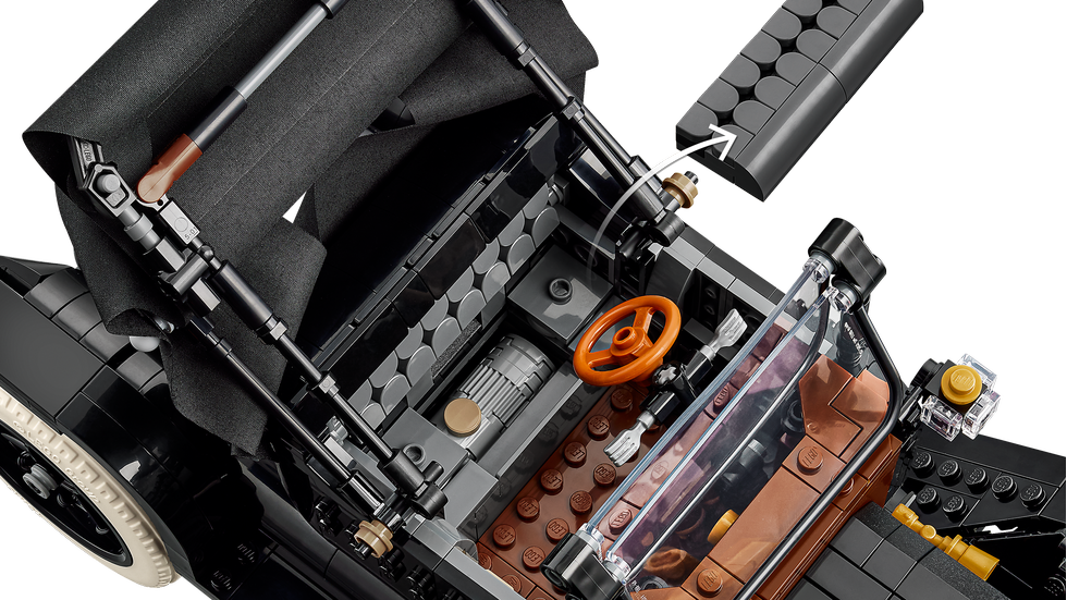 VINTAGE CAR MODEL – Recreate the iconic 1910s automobile with gleaming black bodywork, golden accents, a foldback fabric roof and tall spoked rims with slim white rubber tires
