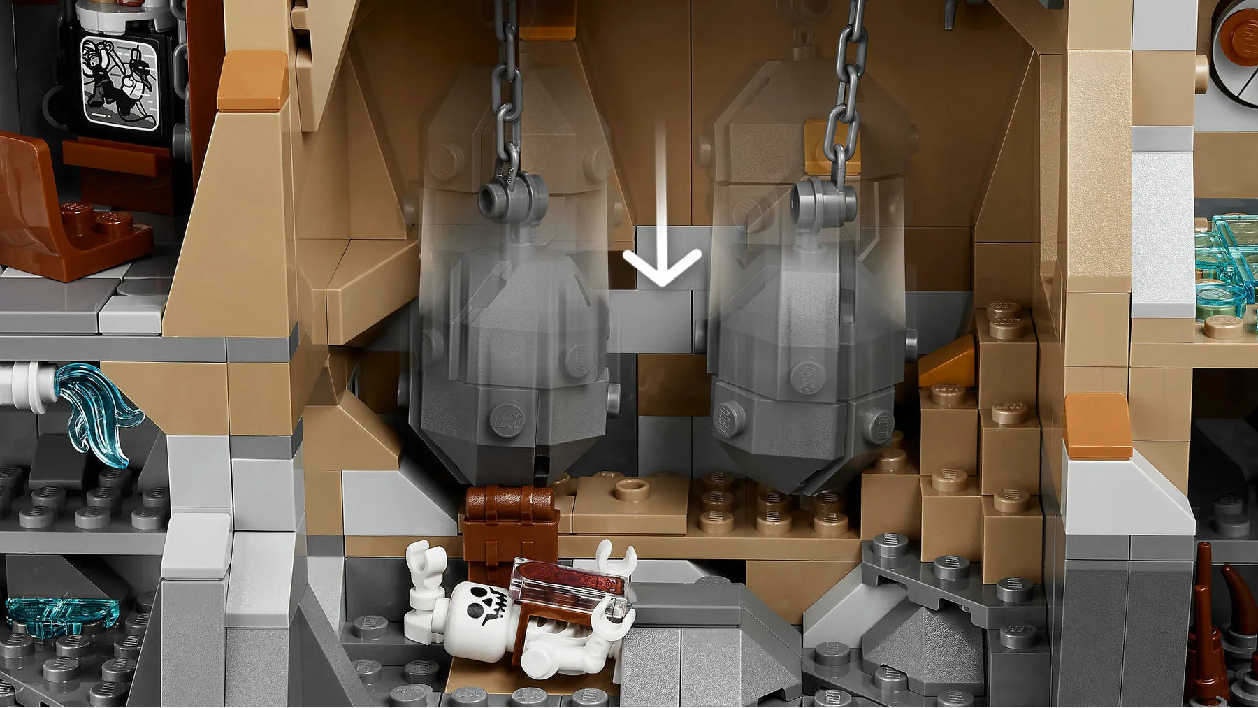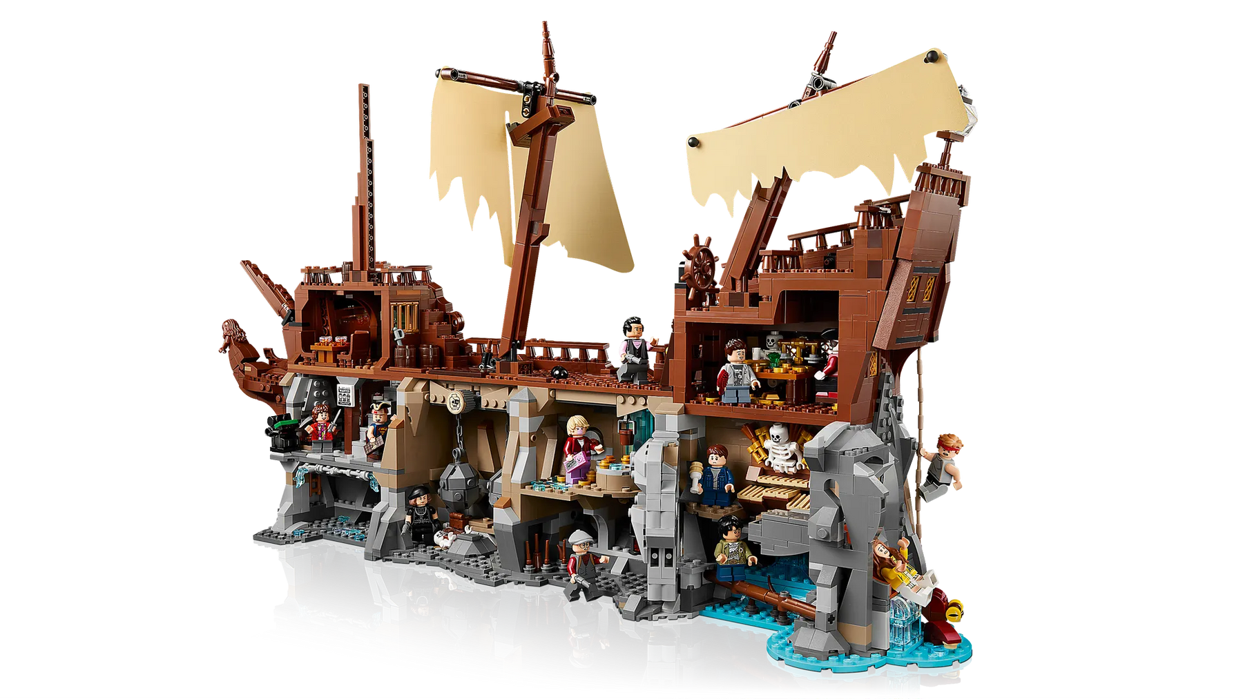 Iconic scenes – Build the Fratellis’ hideaway and basement, Willy’s treasure room and more cave scenes on one side of the model, and Inferno pirate ship ruins on the other