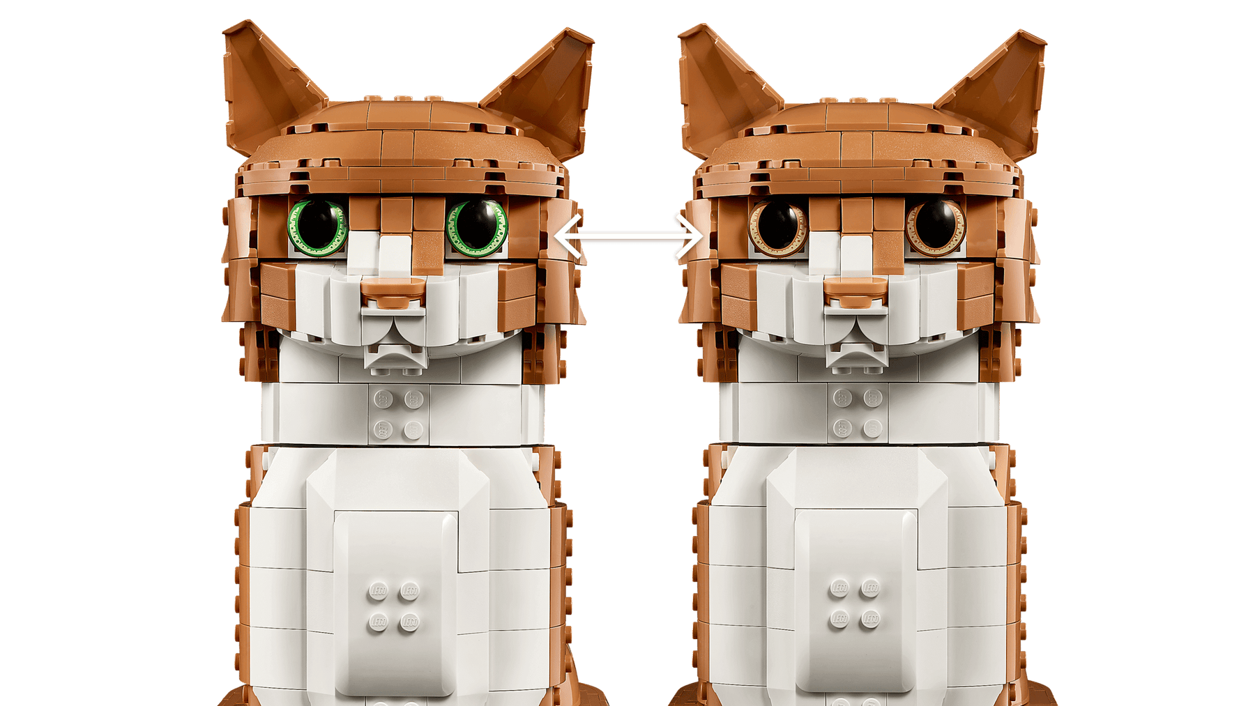 CAT COLLECTIBLE – The black and white LEGO® Ideas Tuxedo Cat (21349, sold separately) and this Orange Cat are suitable feline companions; the eyes are compatible with both models