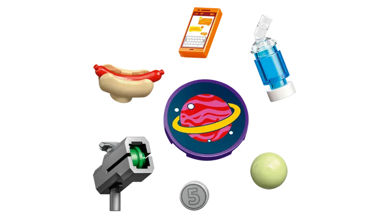 LOTS OF ACCESSORIES – Fuel storytelling with slushies, hot dogs, a phone, a gumball machine, cash registers, a coin, plus a side build with a dance machine, a trampoline, a jumping bunny ride and more