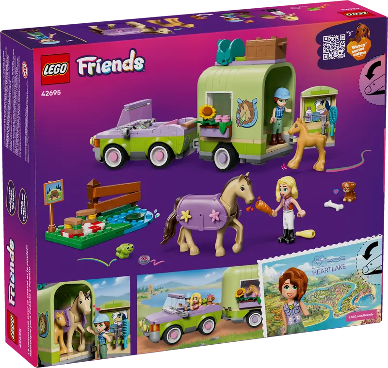 Let kids ages 7 and up enjoy hours of animal care role play with the LEGO® Friends Horse & Baby Foal Trailer building toy (42695). This set for horse lovers includes 2 minidolls plus a horse, foal, puppy and frog figures. Explore every aspect of animal care using the detailed accessories to groom the horses, transport them in the trailer and ride the horse over the jump. There are lots of different ways for girls and boys to play with this animal playset. They can create stories for Autumn and Matilde as they drive the car. Open the trailer to greet the horse and foal. Then saddle up the horse, ready for a ride. The model comes with a small side build with a picnic area, signpost, lake and a fence to jump over. This set makes a cool gift for horse lovers or a fun birthday gift for kids who love animal playsets. And with the LEGO Builder app, kids can enjoy intuitive building as they can zoom in and rotate sets using 3D instructions, save sets and track progress. Set contains 279 pieces .