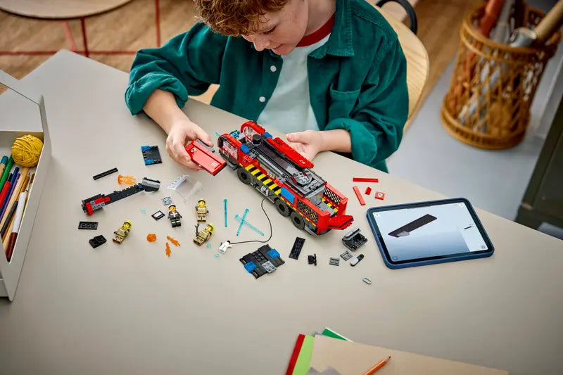 Mobilize the LEGO® City Airport Fire Truck (60499) for kids ages 7 and up. This realistic emergency vehicle toy features a 360° rooftop extinguisher, opening side equipment bays and tool storage compartments. Kids can turn a dial to steer the truck, launch water elements from the extinguisher and remove the engine for repairs. The toy truck comes with 8 chunky rubber tires and a detailed cockpit with seating for the 4 firefighter minifigures. Just add a sprinkle of imagination to ignite hours of heroic firefighting adventures. This toy truck building set makes a great birthday or any-day gift for kids with a passion for hands-on play. Use it with other LEGO City sets (sold separately) for even bigger adventures. Kids can build with confidence using the LEGO Builder app where they can zoom, rotate in 3D and track progress with easy-to-follow digital instructions. Set contains 691 pieces.